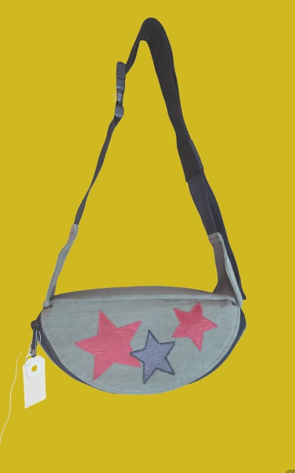 Diese einzigartige, handgefertigte Gürteltasche kombiniert praktischen Stauraum mit einem liebevollen, detailreichen Design. Der olivgrüne Stoff wird durch aufgenähte Sterne in Rot und Grau stilvoll ergänzt und macht die Tasche zu einem echten Hingucker.